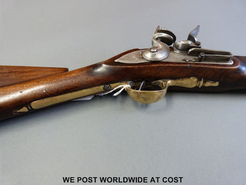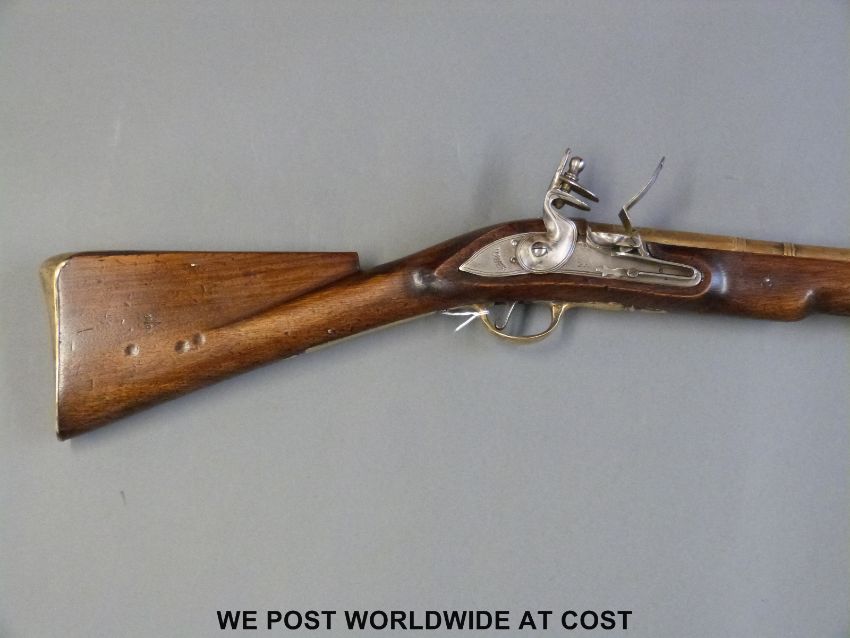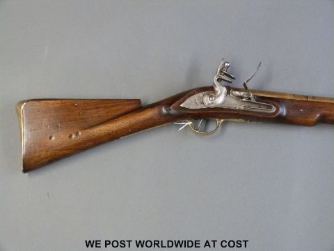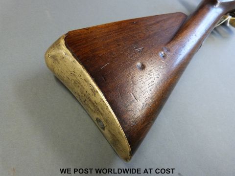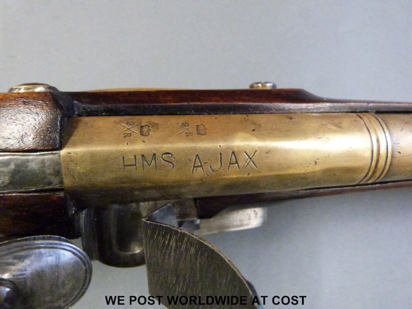 A flintlock brass barrelled blunderbuss with 16 inch part octagonal barrel stamped to the top 'HMS AJAX' and with crown over GR proof marks and to the end 'From Jolly Jack Tarr', steel lock plate marked Tower and with crown over GR cypher, brass trigger guard and butt plate and stamped to the stock BO and military broad arrow and L14, overall length 80cm.