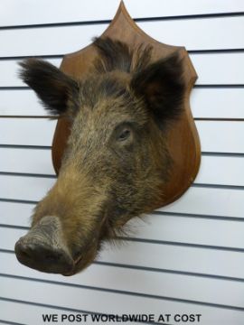 A taxidermy study of a boar's head, height of plaque 70cm, plaque to tip of snout 62cm