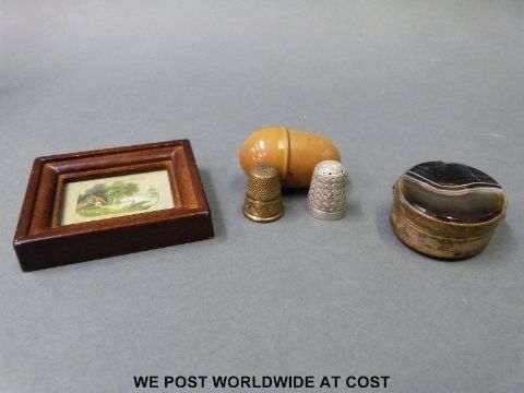 A porcupine quill box continuing a quantity of collectables to include agate box, coin, brooch, hallmarked silver thimble, miniature painting etc