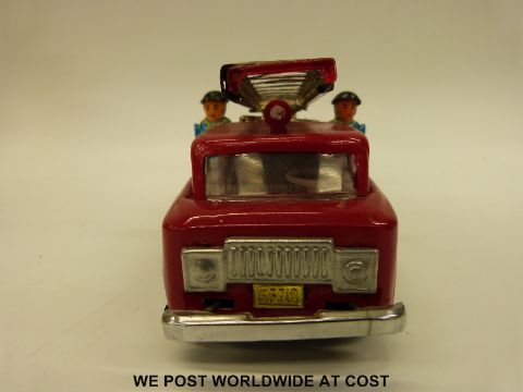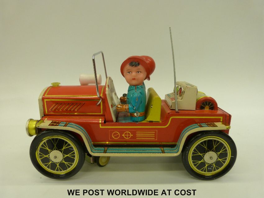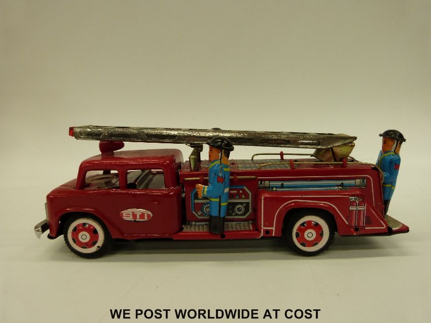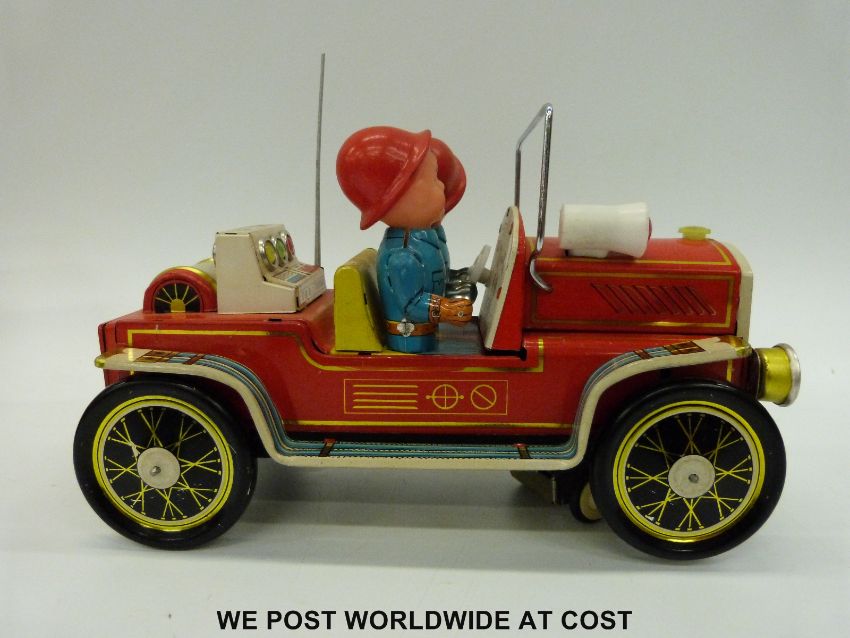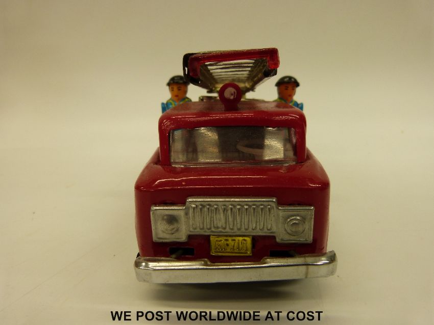 Three tin-plate model fire engines comprising of a Japanese Fire Chief car ME 699, a French friction powered Fire Truck with siren MF 718 and a French Firefighters Jeep with Tank Trailer, all in original boxes