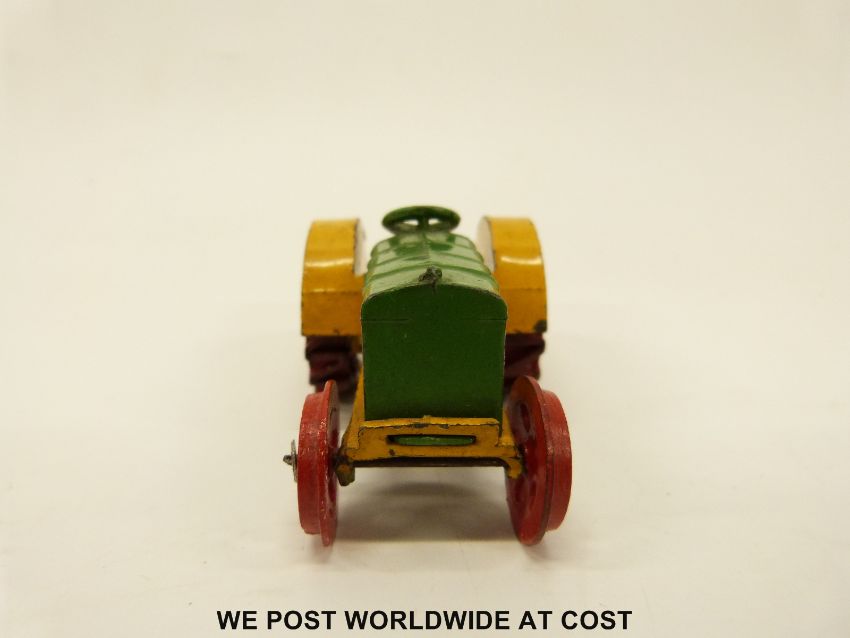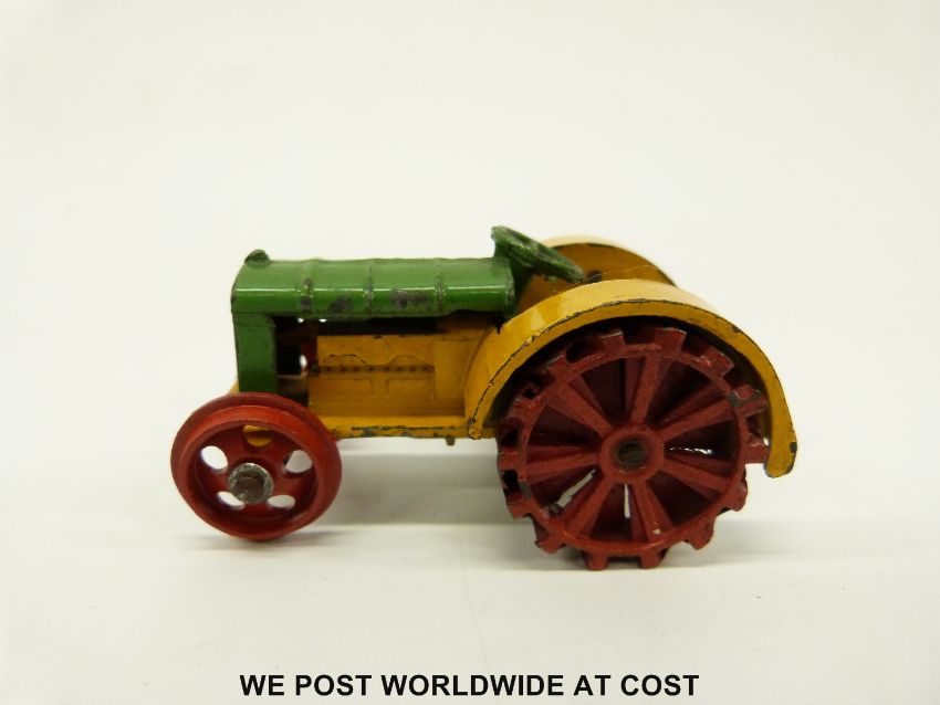 Dinky Toys diecast model Fordson N tractor with green and yellow body and red wheels