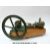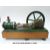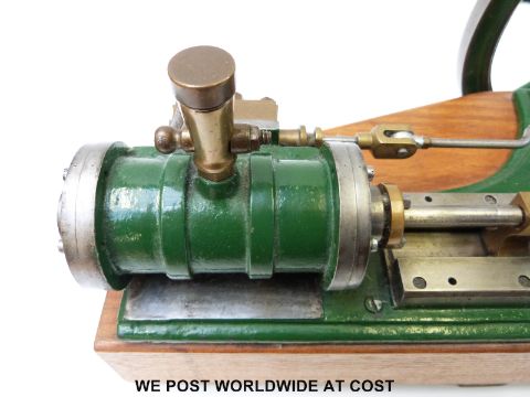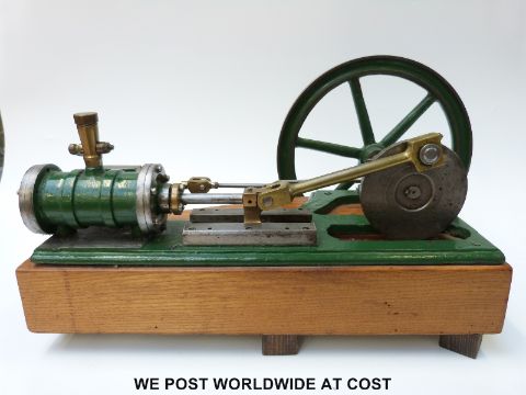 A horizontal stationary live steam engine mounted on a wooden base with 26cm diameter flywheel and cyclinder with lubricator