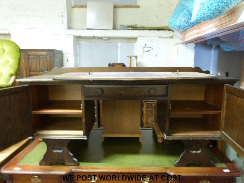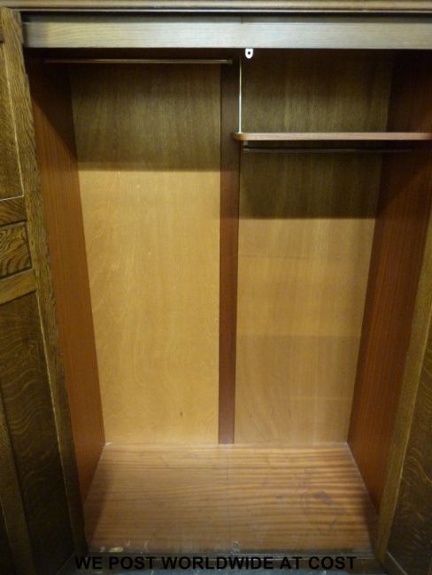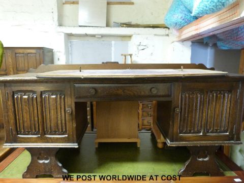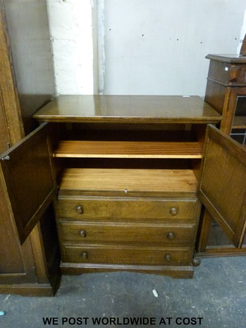 An oak Old Charm style linen fold bedroom suite comprising two wardrobes, tallboy and dressing table, largest 180cm tall