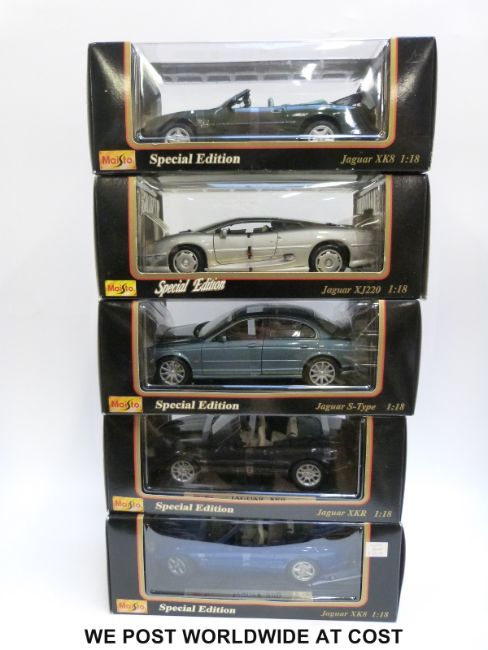 Five Maisto Special Edition 1:18 scale diecast model Jaguar cars comprising two XK8, XJ220, S-type and AKR, all in original boxes