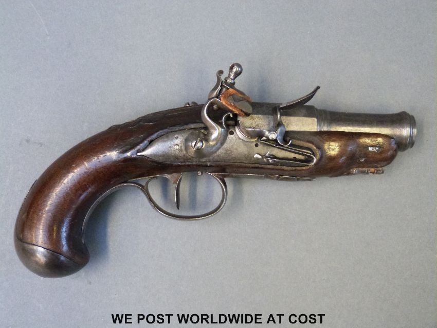French flintlock hammer action pocket pistol with three inch part octagonal cannon barrel and carved stock, overall length 19cm.