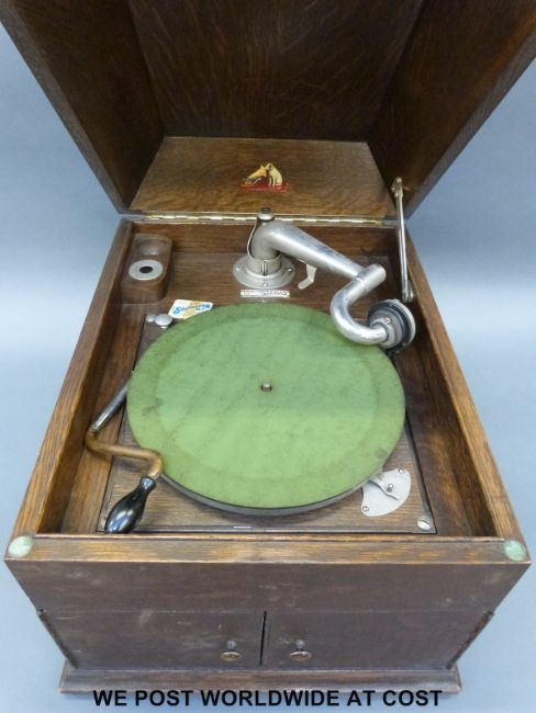 HMV vintage wind up gramophone with internal horn and retailer's label for Dale, Forty & Co. Ltd., Cheltenham together with a tin of Songster needles