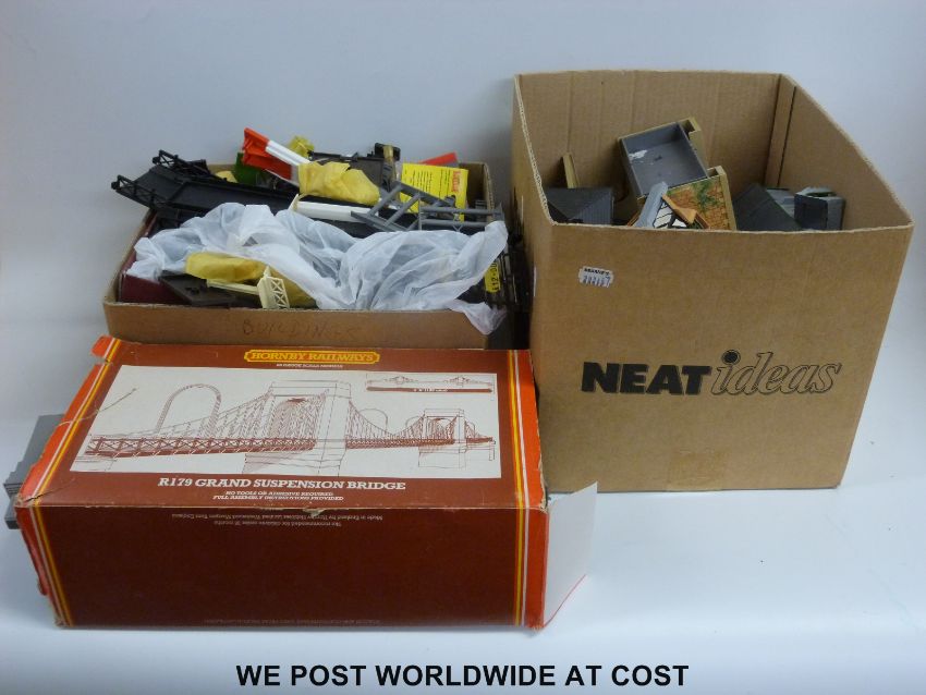 A collection of Hornby 00 gauge buildings and accessories, some in original boxes.