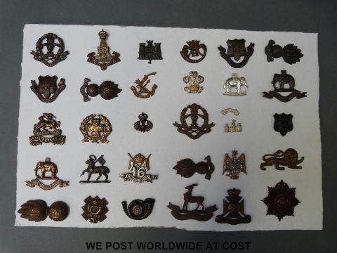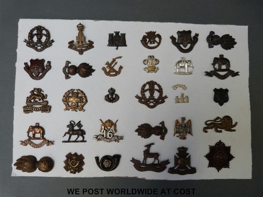A carded display of 30 British army officer's collar badges, Middlesex Regiment, Hampshire, Cornwall, 16th Lancers, Welsh Fusiliers, Bedford Yeomanry, etc.