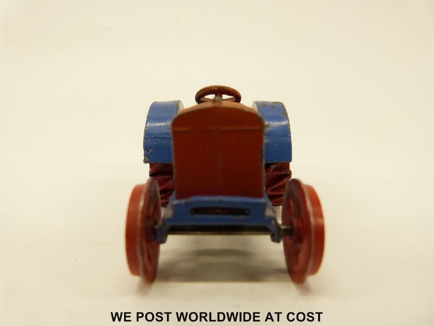 Dinky Toys diecast model Fordson N tractor with blue and red body and red wheels