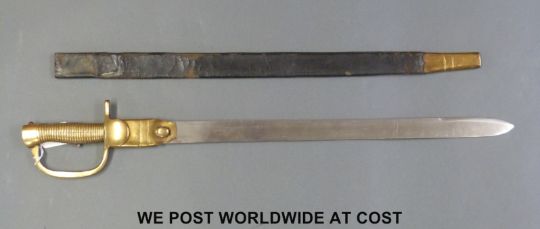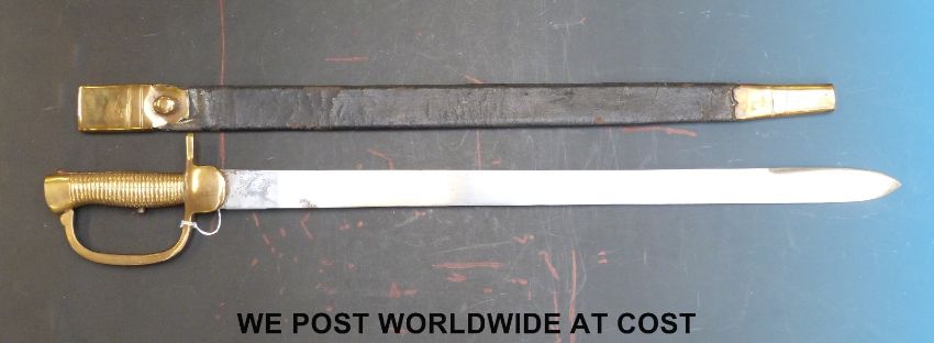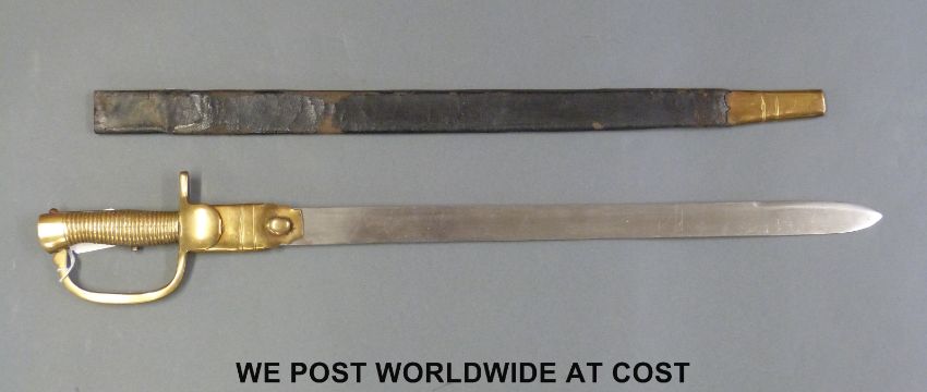 A reproduction Baker 2nd pattern Infantry rifle sword bayonet stamped Osborn and Gunby to blade with leather and brass sheath (59cm blade)