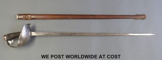Henry Wilkinson 1912 pattern 20th Hussars British Calvary officers' sword, etched to blade RMT, probably for Captain R.M. Thompson who served throughout WW1 on the western front, he retired to the Cirencester area. The sword is impressed "44276 and London made" the serial number indicating the sword was one of 534 made in 1913, in original leather covered scabbard