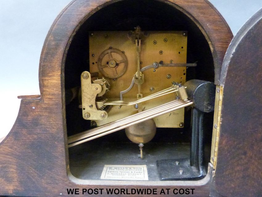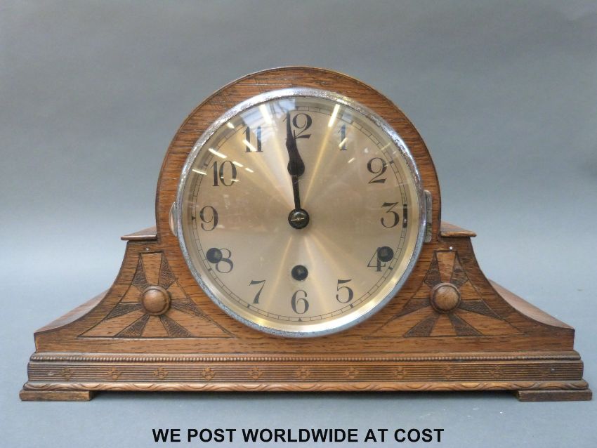 An oak cased mantel clock, Picquot ware part tea set, oak box, silver plated items etc