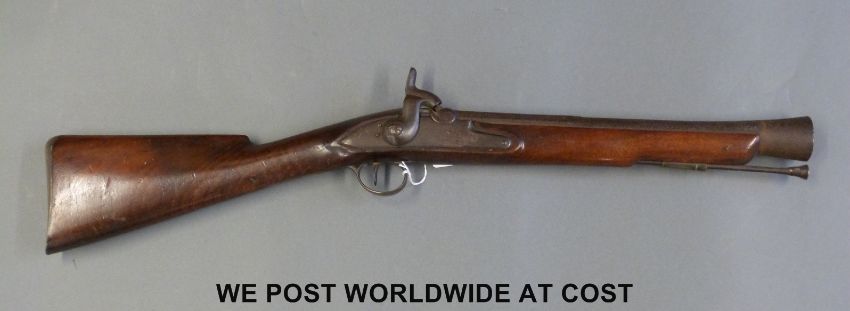 A steel barrelled percussion converted from flintlock hammer action blunderbuss with brass trigger guard and butt plate stamped N-T 32 and 15 inch part octagonal barrel, c1800, overall length 79cm.