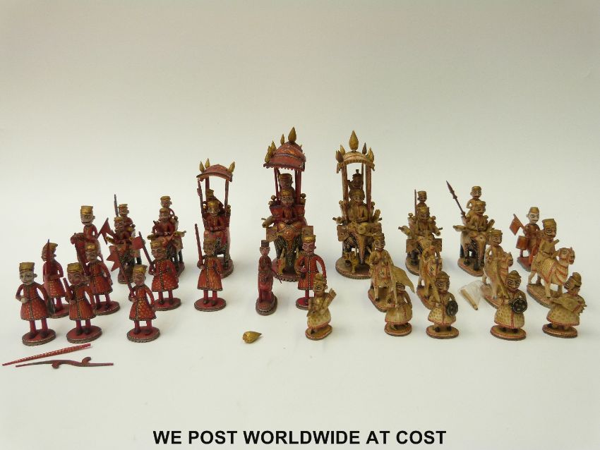 A late 18thC / early 19thC Indian ivory part chess set with hand-decorated gilt and painted decoration. The major pieces modelled as war elephants with howdah, cannon and the king elephant's trunk wrapped around a tiger (height of king 15cm). Slip of paper with with set suggests chessmen Jodpur, Raputana 1800, representing Raypur troops (possibly Rajpur), 27 pieces