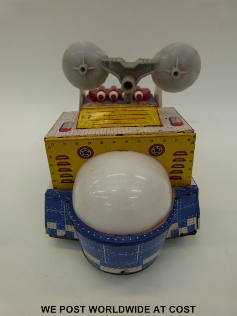 Clifford Series battery operated Moonranger with supersonic sound, in original box together with a remote control K9 dog, tin plate Universe Boat and an Everlast Toys robot money box