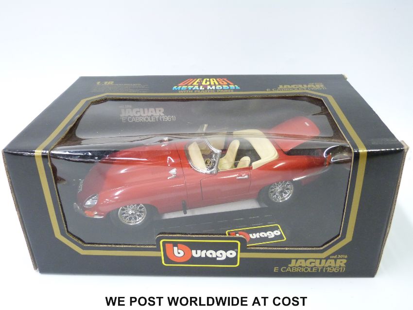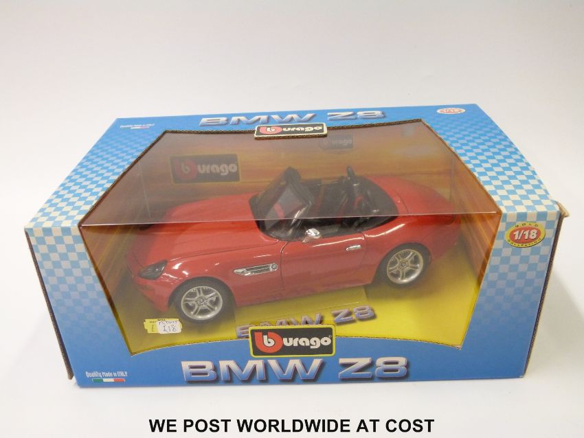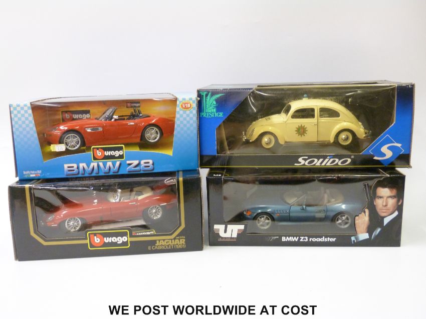 Four Burago, Solido and other 1:18 scale diecast model vehicles including James Bond, BMW, Police VW Beetle, etc. all in original boxes