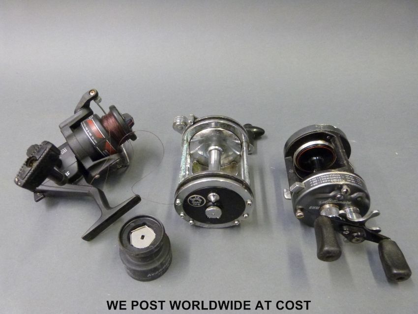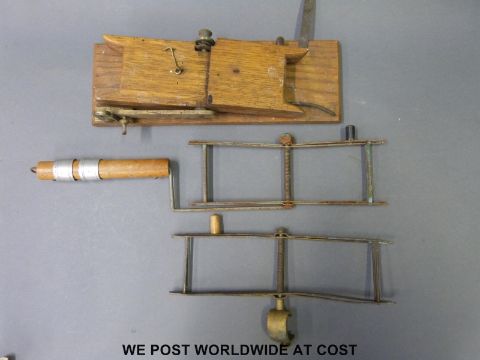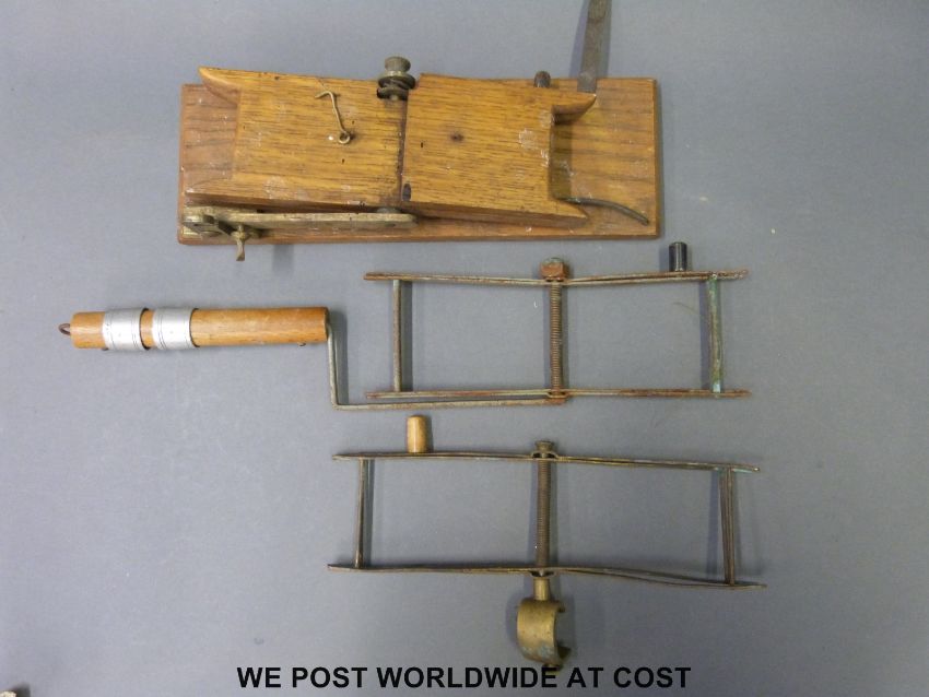 A collection of vintage fishing tackle including Ogden Smiths "Spinos" reel, brass reel with number 8 impressed near foot, Wilkes Osprey wooden reel with brass fittings, another unmarked but probably by the same manufacturer, two multipliers, Griffin model 500-B and a Daiwa Millionaire 6HM, two metal line driers and accessories.