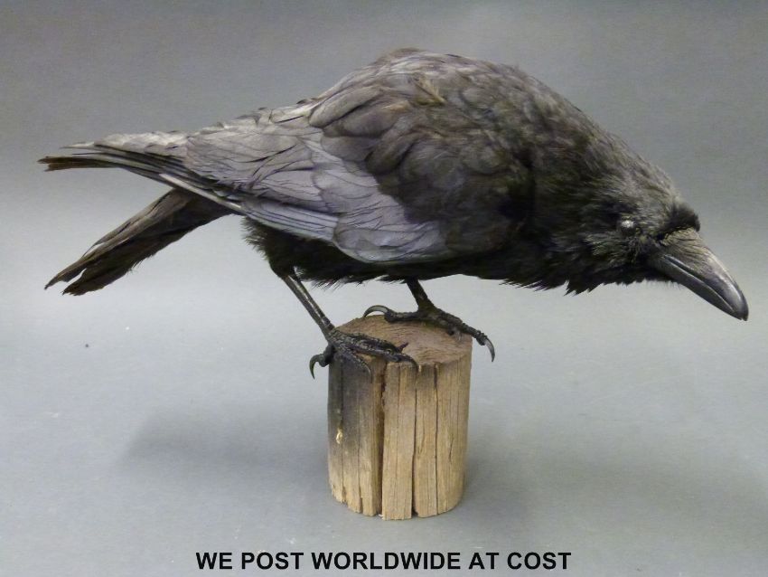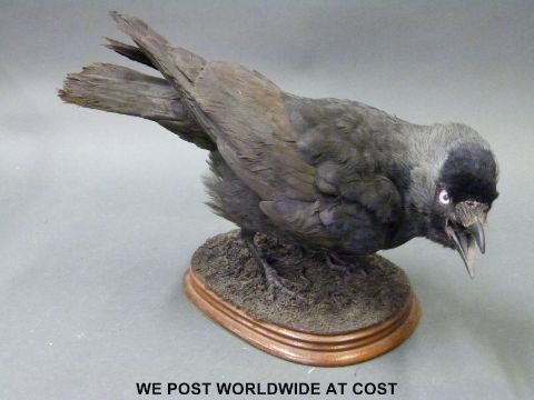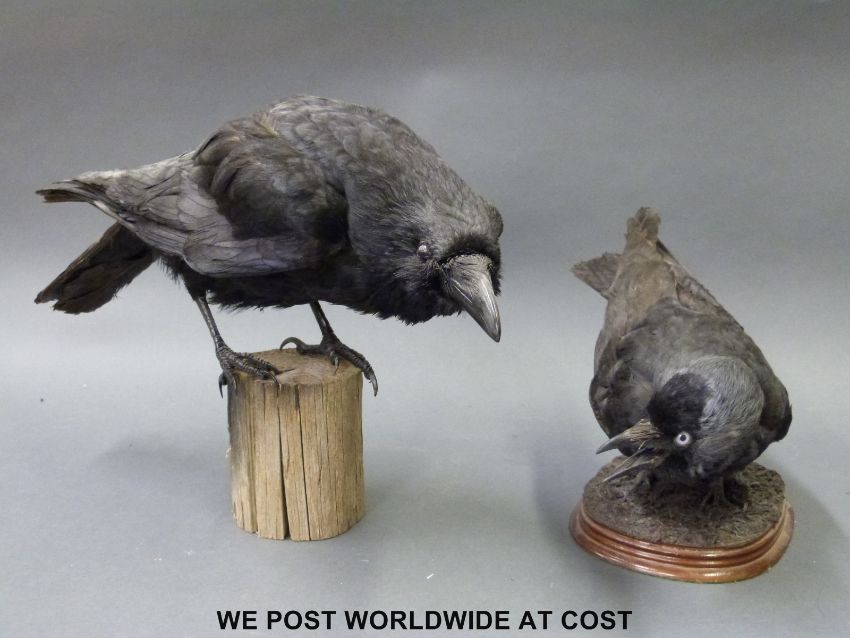 A taxidermy study of a crow on a wooden base together with a similar jackdaw, tallest 30cm