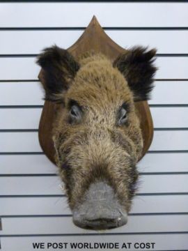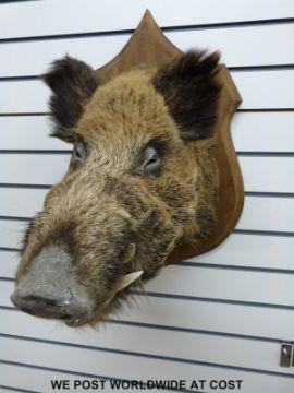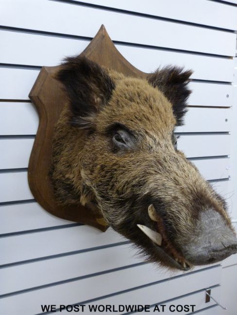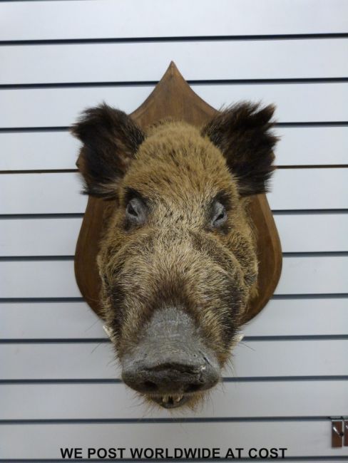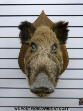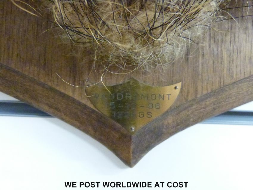 A taxidermy study of a boar's head, brass plaque reads 'Vaudremont 122 kilos' height of plaque 70cm, plaque to tip of snout 70cm