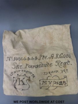 A leather military belt with sixteen military cap badges attached to include Artists, Bedfordshire and Hertfordshire etc. together with a Parachute Regiment kit bag