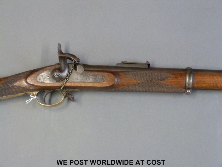 Private purchase Enfield three band muzzle loading percussion hammer action rifle stamped to the lock with crown cipher 1861 Tower and with retailers name Furniss Truro, 39" barrel, brass trigger guard, butt plate and mounts and chequered grip, overall length 140cm. Together with a copy of an 1865 Western Morning Times Plymouth advert for Thomas C Furniss and his details in the 1861 census.
