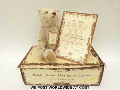 Steiff Original British Collectors 1911 replica Teddy Bear with blonde mohair, jointed limbs and growler, limited edition 1991 of 3000, in original box with certificate.