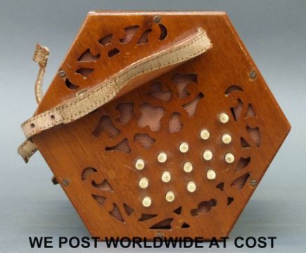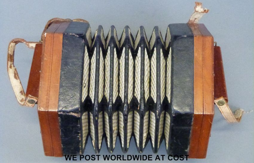 A c1900 Anglo Lachenal concertina with 30 bone buttons, wooden fretwork ends and five fold bellows
