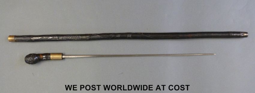 A 19thC or early 20thC sword stick with 55cm four faceted tapering steel blade, brass collar and carved stick, overall length 92cm