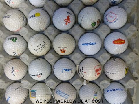 Approximately 400 golf balls with logos in egg cartons, most well known makes with further advertising logos including Manchester United, Volvo, Citroen, Coca Cola, hotels, drinks, hospitality etc.
