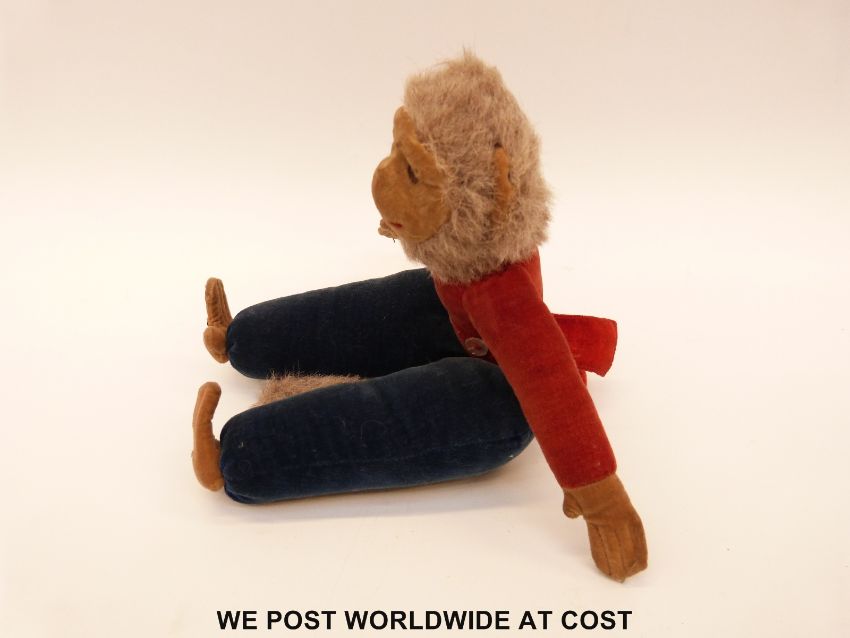 Nora Wellings felt monkey with blue trousers, red top and mother of pearl buttons, 28cm tall