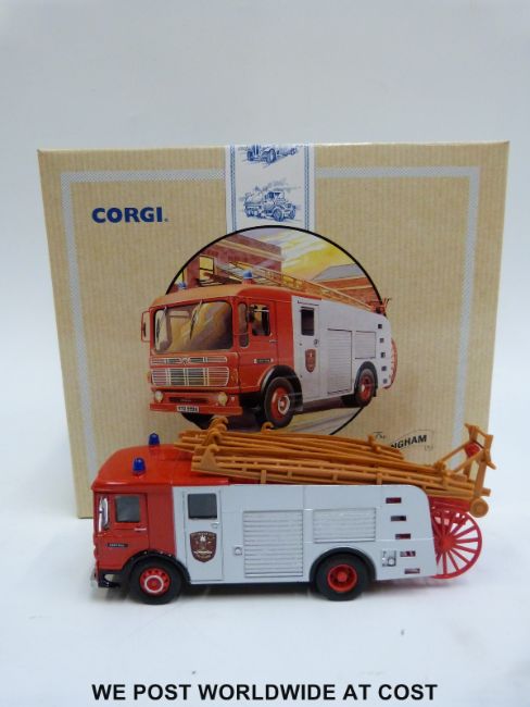 Three Corgi Classics limited edition diecast model fire engines and fire engine sets, The LaFrance Fire Vehicles Scottdale & South River 97331, The Nottingham AEC Pump Escape Fire Engine 97355 and The Cardiff AEC Ladder Fire Vehicle 97385, all in original boxes