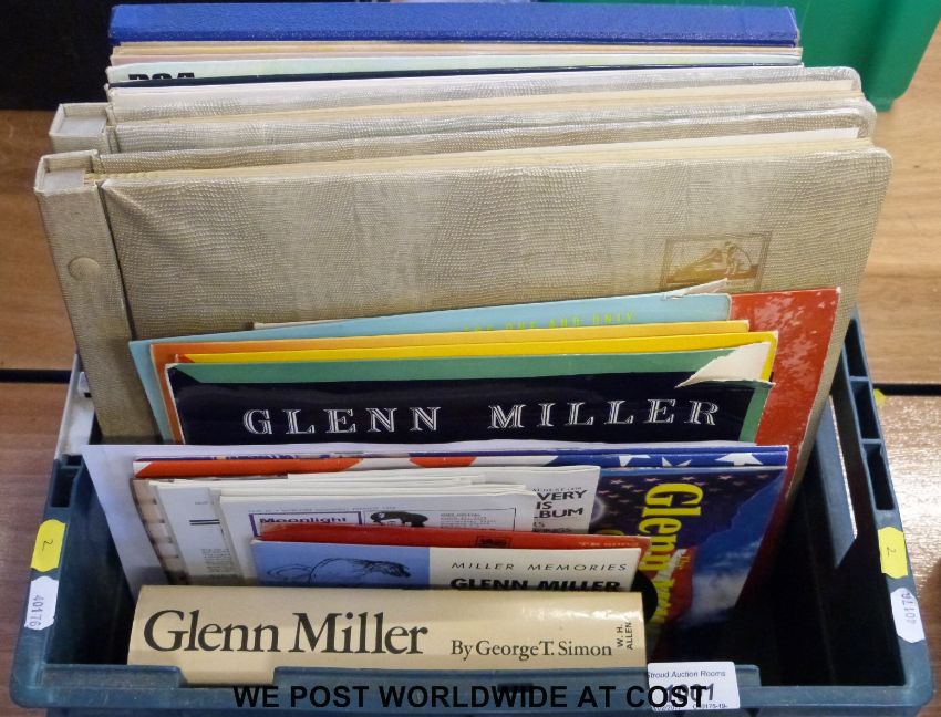 A collection of Glenn Miller 10” & 12” LPs (16x records in total) and books & magazines. Includes “Limited Edition Volumes 1 & 2” (HMV RLS 598 and 599, both are sets of 5x LPs in a hessian book).