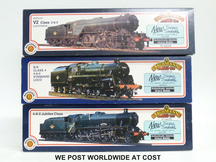 Three Bachmann 00 gauge locomotives, BR 4-6-0 Class 4 'The Green Knight' 75029 31-106, LMS 4-6-0 Jubilee Class 'Impregnable' 5721 31-154 and LNER 2-6-3 V2 Class 'Coldstreamer' 4844 31-558, all in original boxes