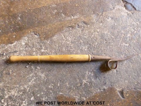 A quantity of countryside collectables including gaff, thatcher's rake, sprayers, spring balances, serrated eel spear etc