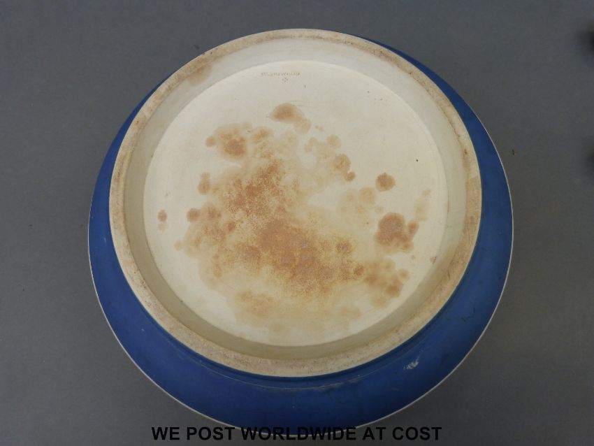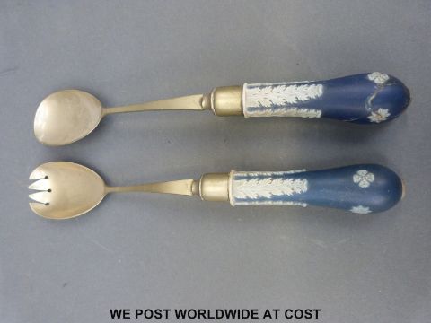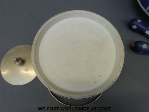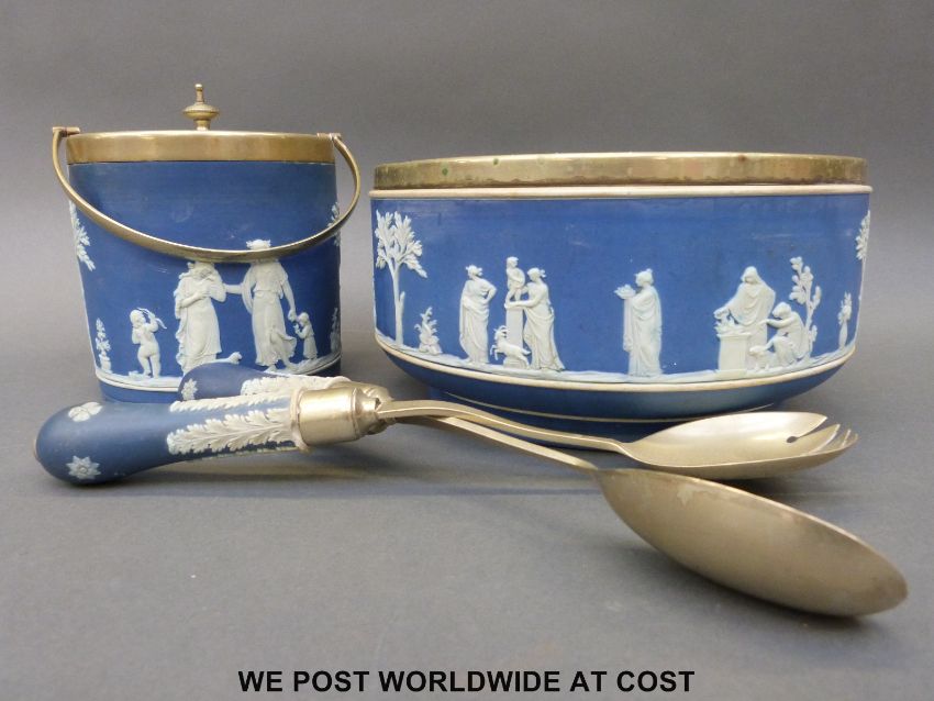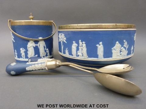 Wedgwood Jasperware bowl, biscuit barrel and salad servers with plated mounts