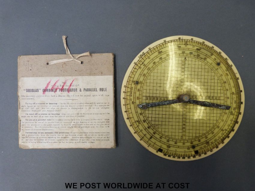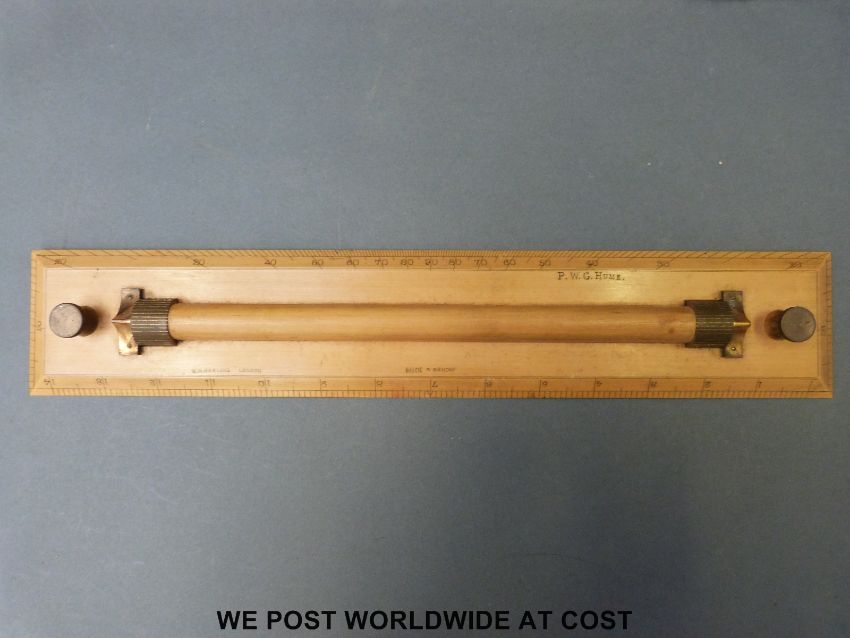 A cased W H Harling ministry marked boxwood parallel rule and a circular plotter