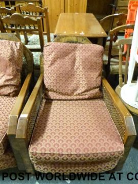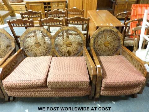An Art Deco walnut bergere three piece suite, length of sofa 117cm