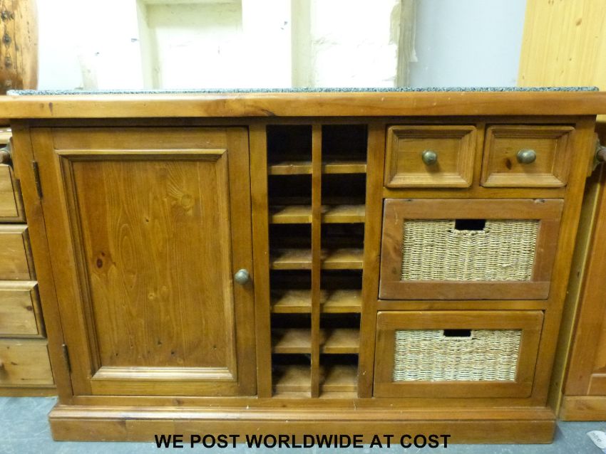 A marble set kitchen island unit with towel rails, wine rack and an arrangement of drawers (W131 x D60 x H87cm)