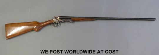 El Chimbo Spanish .410 side by side shotgun with double trigger and folding 27.5 inch barrels, overall length 108cm, serial number 73791 PLEASE NOTE THAT A VALID RELEVANT FIREARMS/SHOTGUN CERTIFICATE IS REQUIRED TO HANDLE/PURCHASE THIS ITEM.
