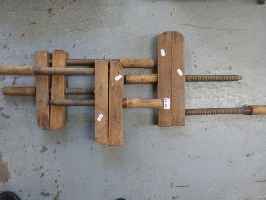 A cased Sargent combination router plane, three vintage wooden clamps, brass and rosewood square, bit and saws etc.