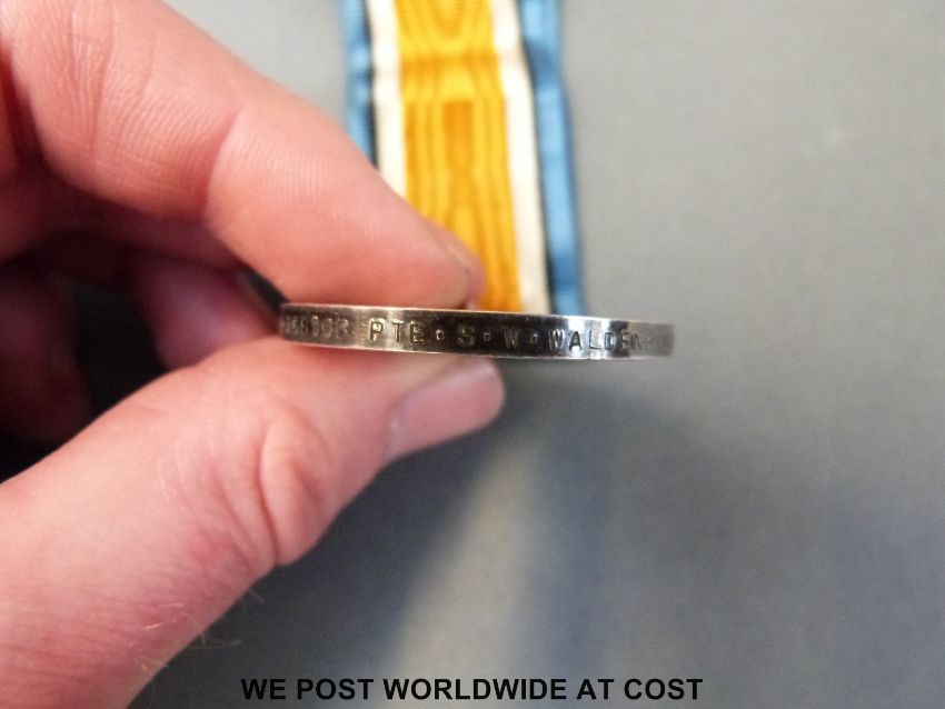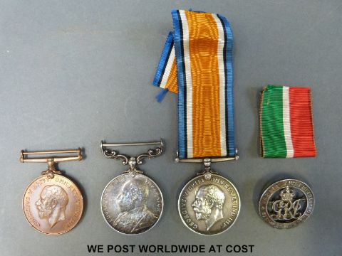 A WWI British war medal awarded to A-358156 PTE SW Walden ASC together with a mercantile marine example stamped Francis J Hawthorne, an Edward VII long service/good conduct medal marked 1760 C SERJT H.Shuttleworth Essex Regiment, and a WWI services rendered badge marked 59345