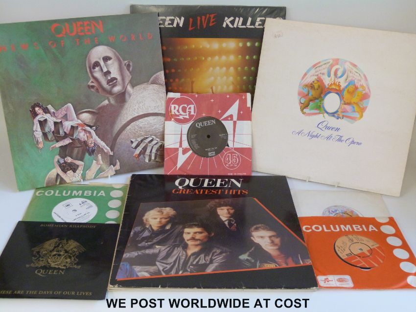 Queen, five LPs and five 7” singles: “Night At The Opera” (x2) (gatefolds with inners); “News Of The World” (gatefold with inner); “Live Killers” (2xLP gatefold with inners); and “Greatest Hits” (with inner). The condition of the vinyl appears to be mostly excellent.