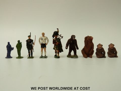 Nine lead figures including four Timpo flock covered animals, Bobby Moore Trendsetter, Robin Hood, Maid Marion etc.