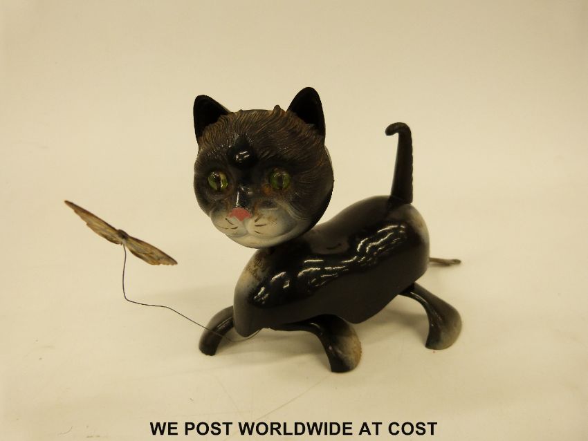 Two Tri-ang Minic clockwork animals a cat with a butterfly and a spider