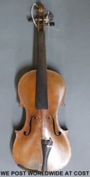 A cased violin labelled 'The Maidstone' John G Murdoch, London E C, 36cm flame back, with bow
