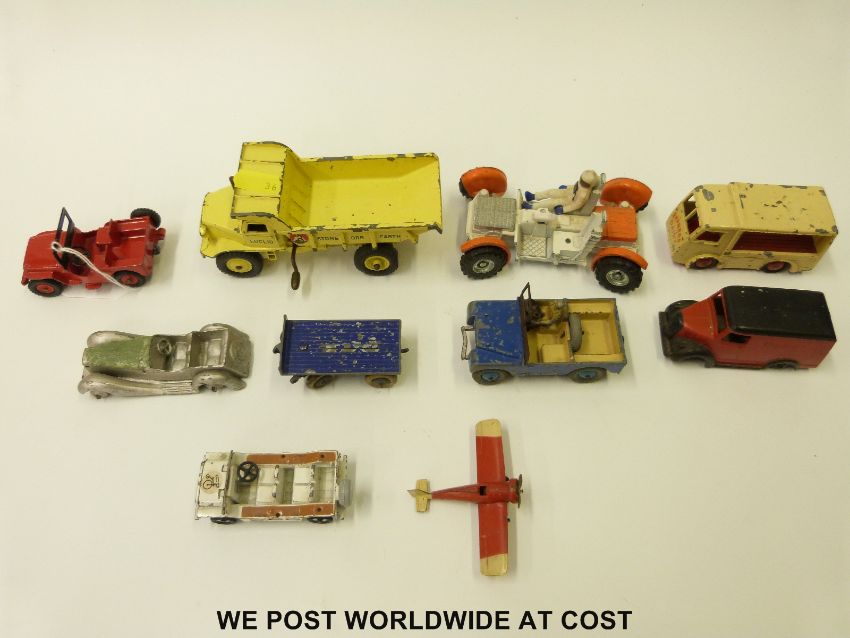 Ten Dinky Toys diecast model vehicles including Electric Van, Aeroplane, Land Rover, Lunar Rover etc