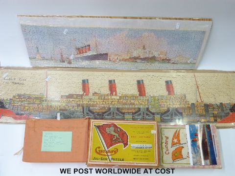 Three Chad Valley Cunard White Star Line jigsaw puzzles RMS Aquitania sectional view, RMS Mauretania Leaving New York and RMS Queen Mary, two in original boxes
