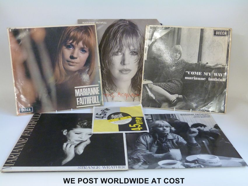 Marianne Faithfull, 4x LPs and one 12” single: “Come My Way” (Decca LK 4688, red label); “Marianne Faithfull” (Decca LK 4689, red label); “Dangerous Acquaintances” (ILPS 9643); “”Strange Weather” (ILPS 9874); and “Broken English/Sister Morphine” (12” Island 12MF 100). There is some variation in the condition of the vinyl of the older items.
