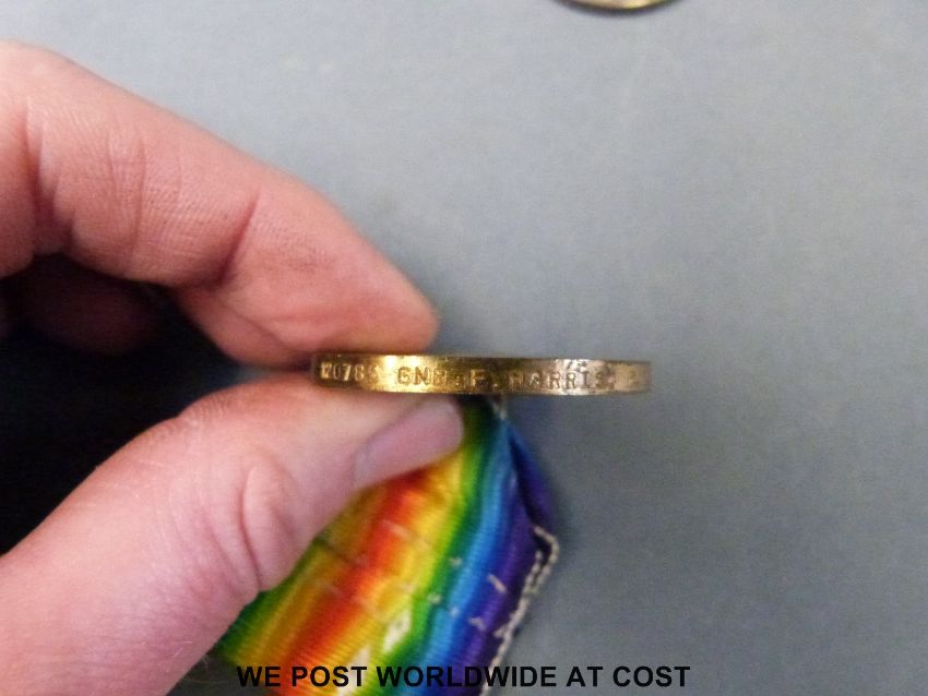 A pair of WWI medals awarded to 120785 GNR F. Harris RA with paperwork