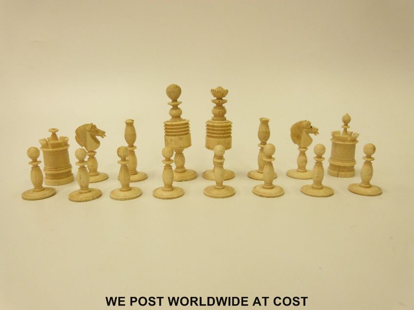 A late 19th/ early 20thC carved bone chess set, one side stained in red, height of king 8cm